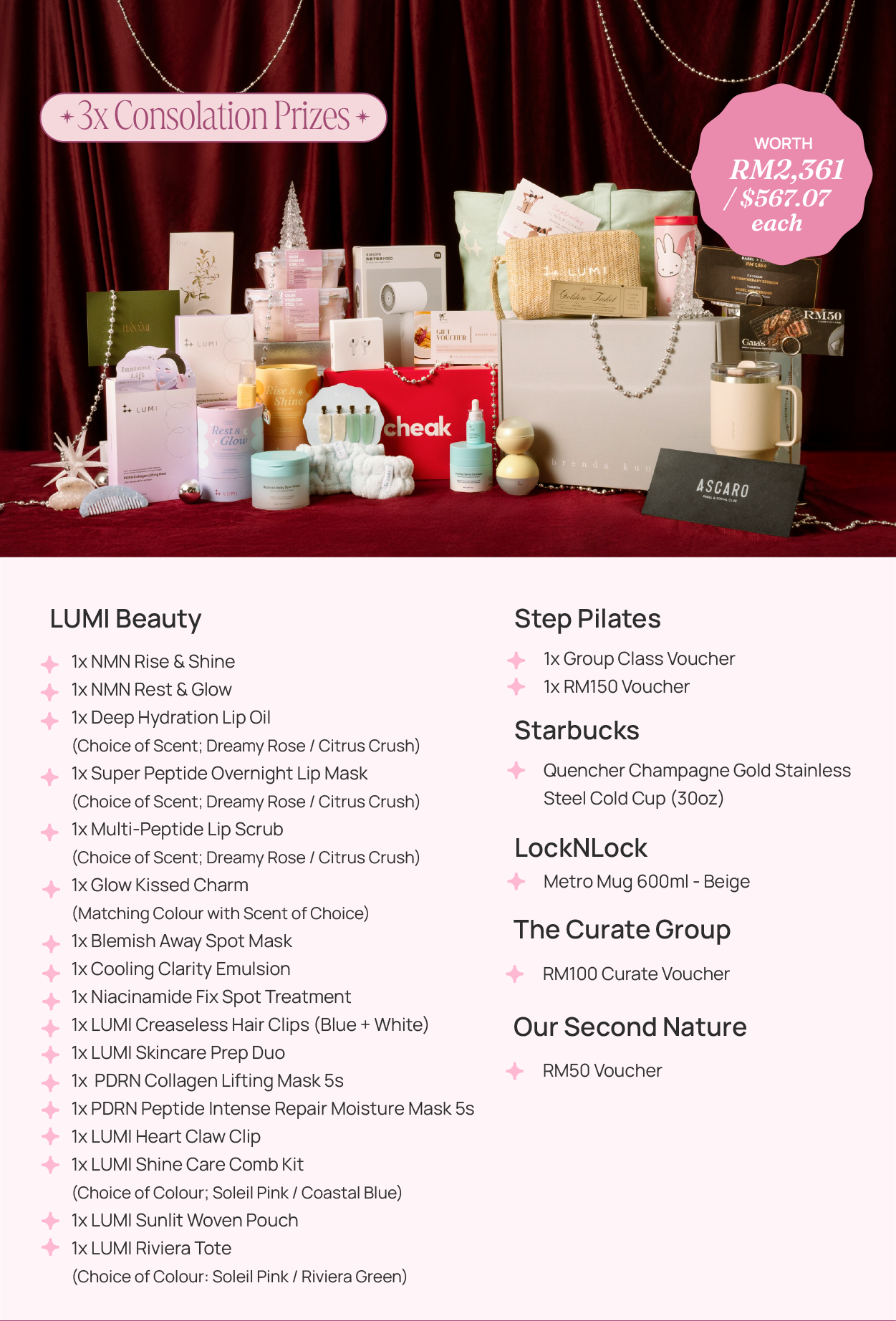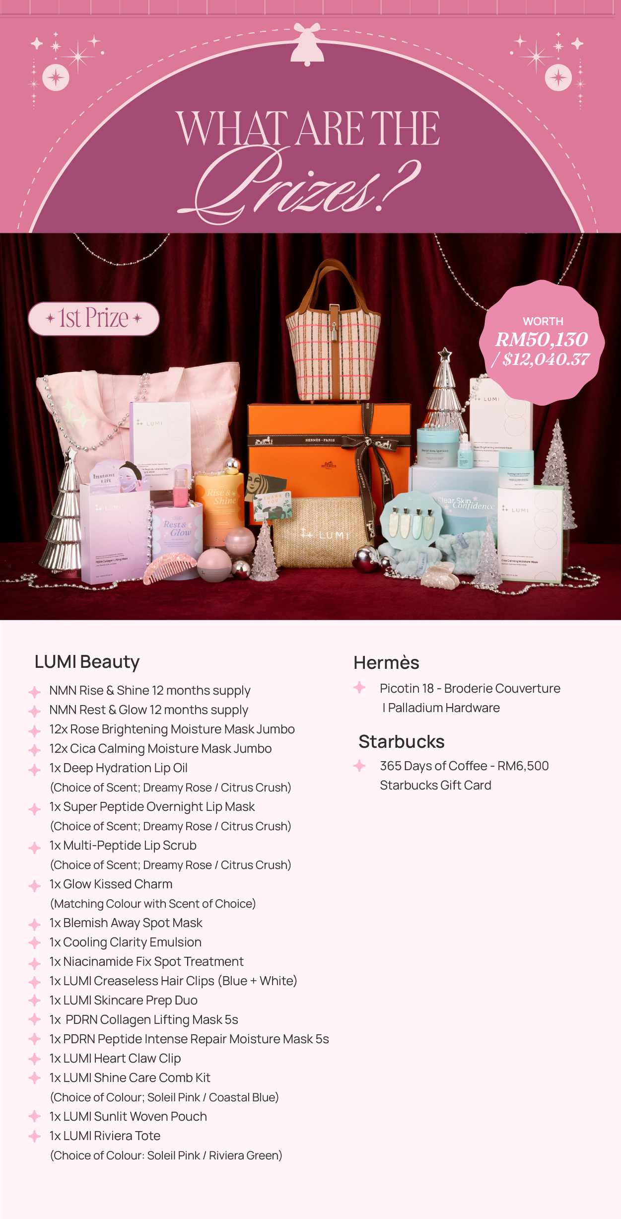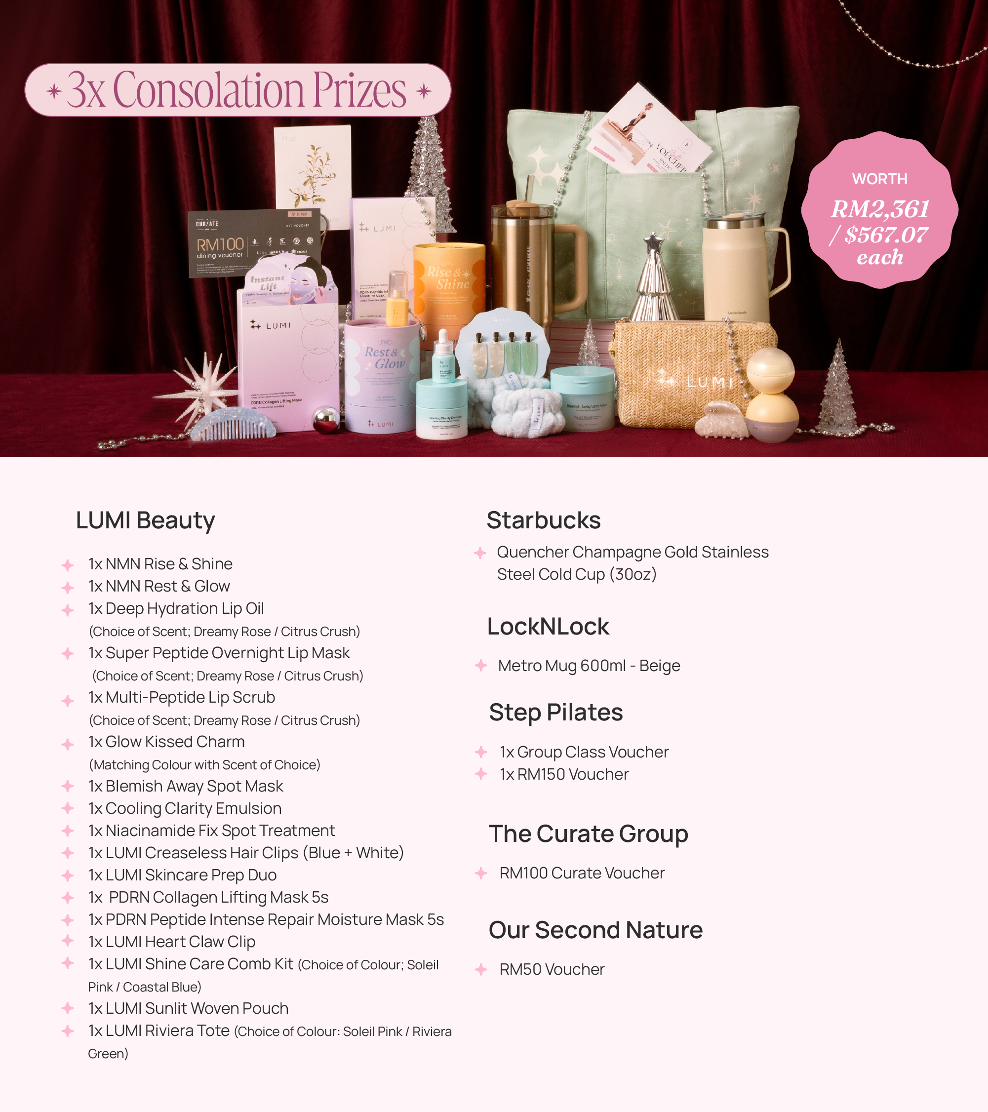 Orders with final checkout value of RM288 / $60 and above, made between 12.00am (GMT+8), 21st November 2025 to 11:59pm (GMT+8), 24th December 2025 on our website mylumibeauty.com and / or LUMI Kiosk at The Exchange TRX, Bangsar Village 2, 1 Utama and IOI City Mall will automatically be eligible for the giveaway.