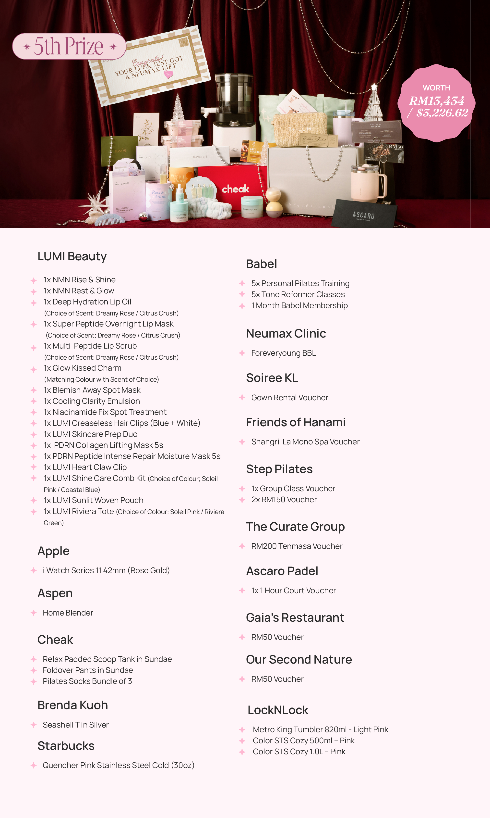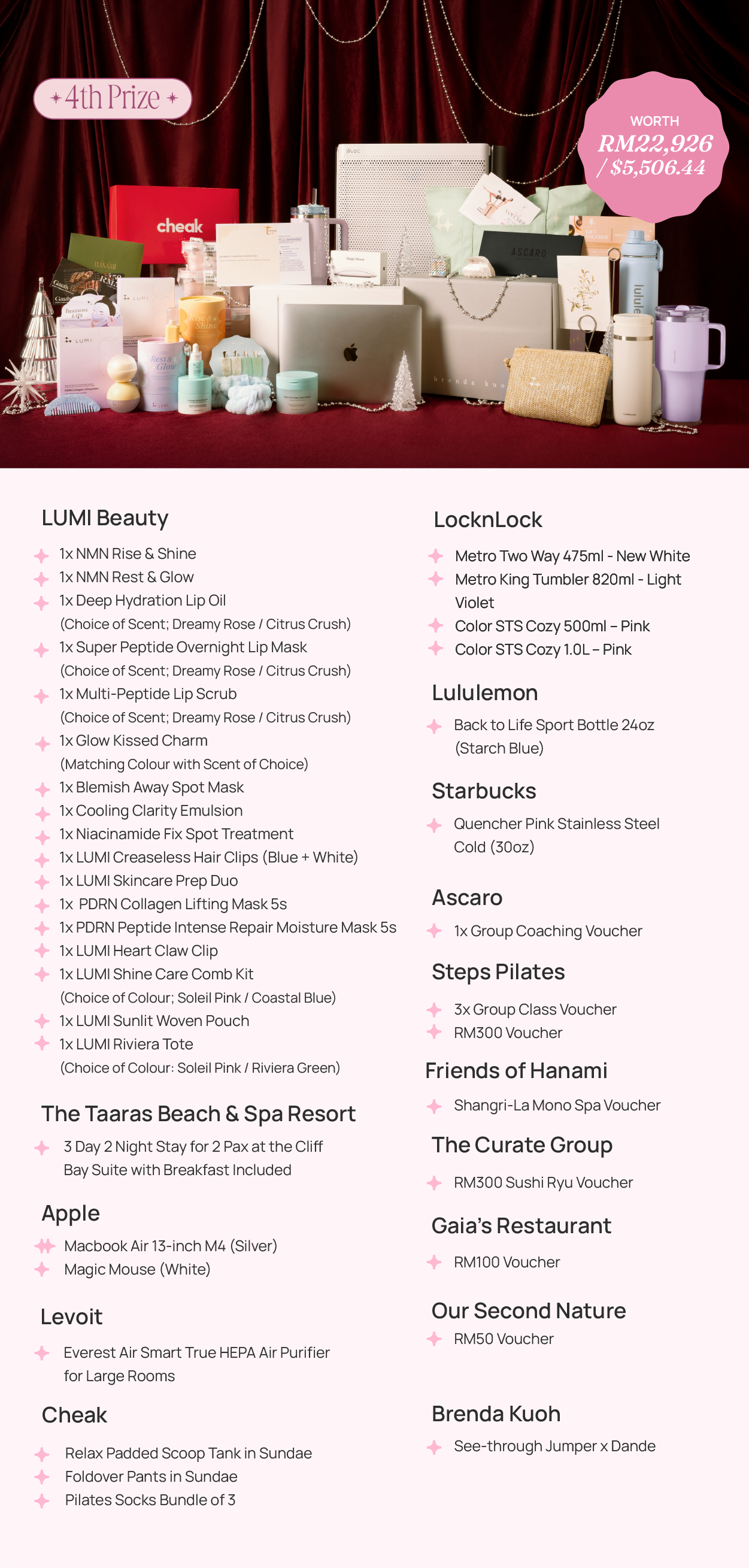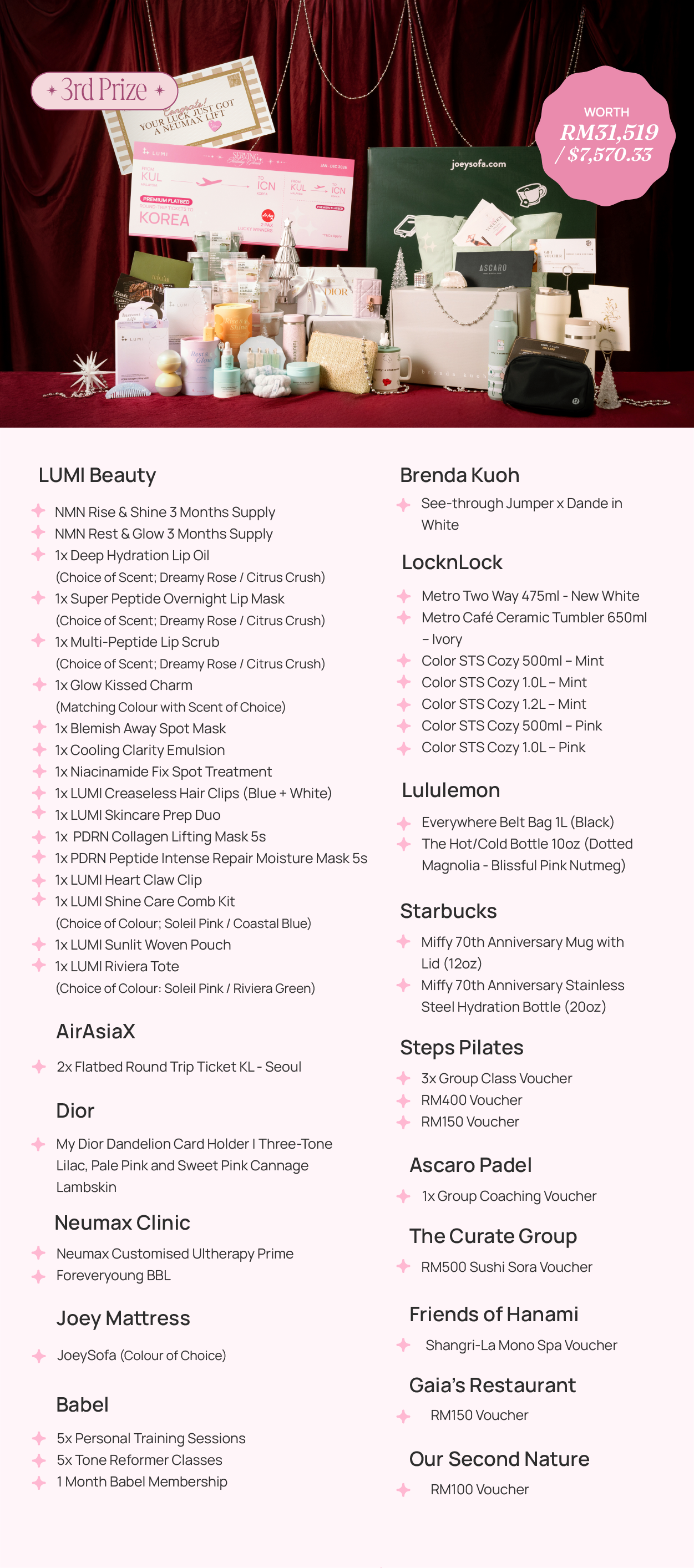 Orders with final checkout value of RM288 / $60 and above, made between 12.00am (GMT+8), 21st November 2025 to 11:59pm (GMT+8), 24th December 2025 on our website mylumibeauty.com and / or LUMI Kiosk at The Exchange TRX, Bangsar Village 2, 1 Utama and IOI City Mall will automatically be eligible for the giveaway.