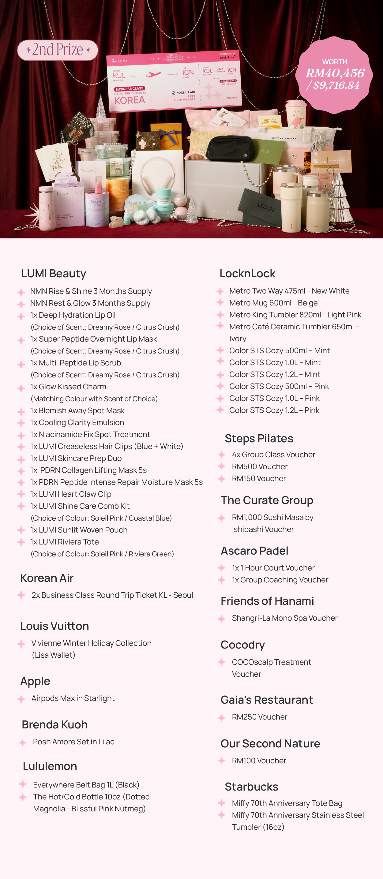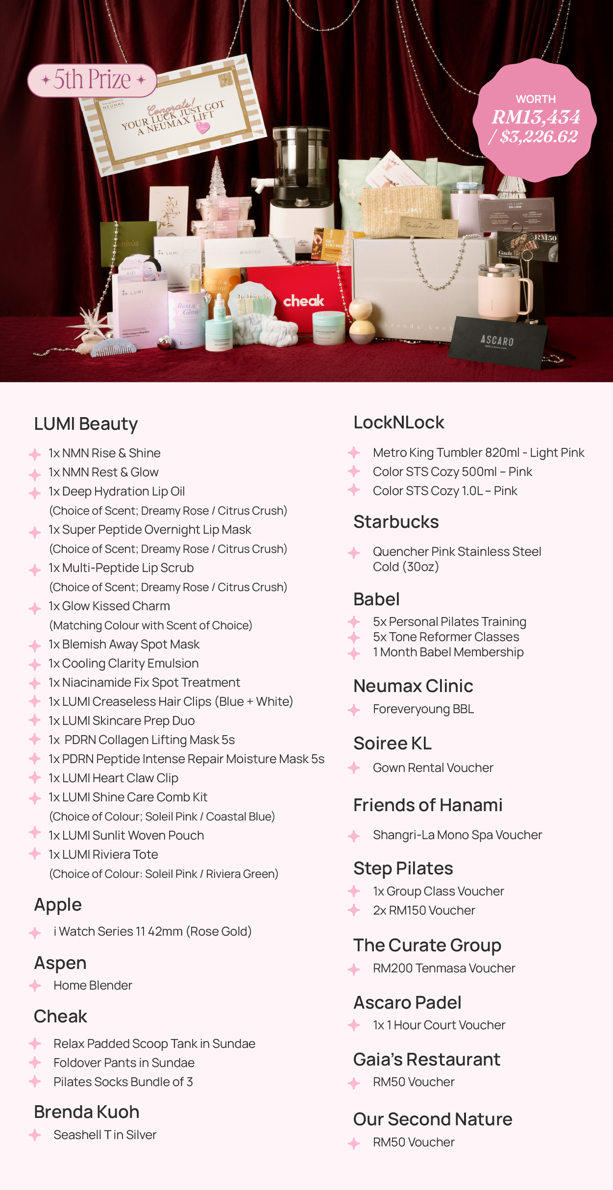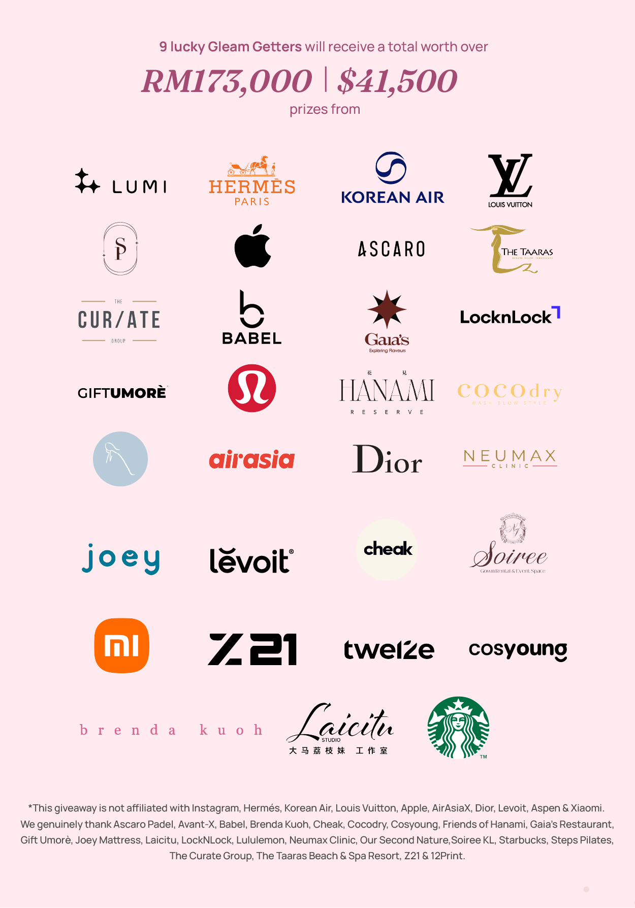 All products available on our website mylumibeauty.com and LUMI Beauty Kiosks at The Exchange TRX, Bangsar Village II, 1 Utama & IOI City Mall. Please kindly note that orders made from Shopee, Zalora, Tiktok Shop, Vending Machines, Guardian and R Pharmacy will NOT be eligible to join the giveaway.
