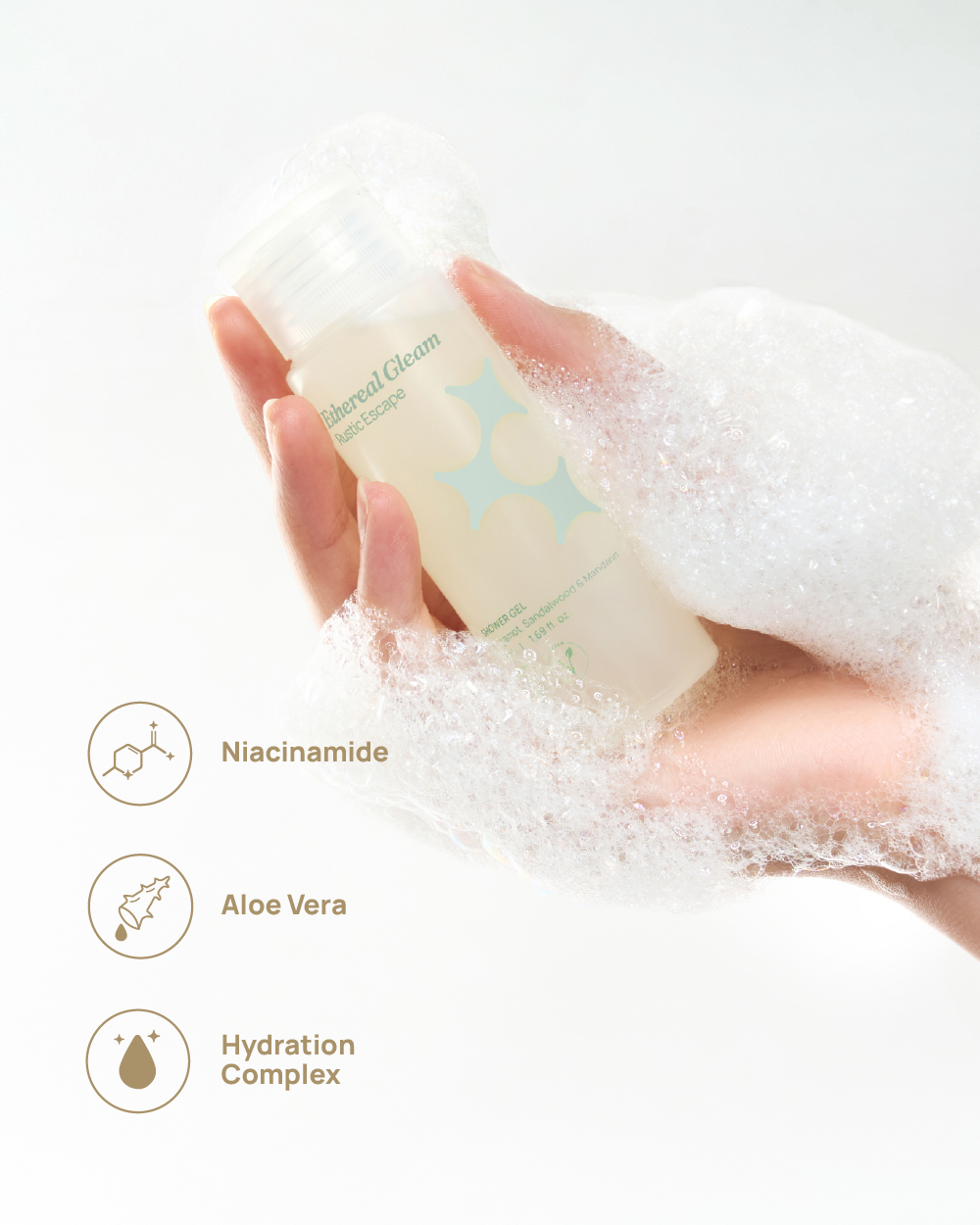 Ethereal Gleam Shower Gel (Rustic Escape) 50ml - This soothing shower gel is scented with Bergamot, Sandalwood, and Mandarin Orange. It is formulated with Niacinamide, Aloe Vera, and a Hydration Complex to gently cleanse the skin without stripping its natural moisture barrier.