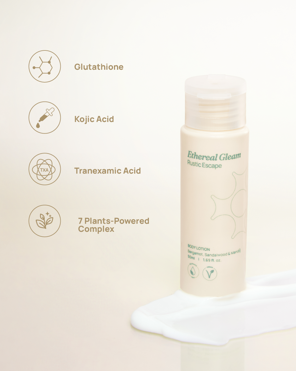 Ethereal Gleam Body Lotion (Rustic Escape) 50ml - A luscious and velvety body lotion crafted with notes of Bergamot, Sandalwood and Mandarin Orange. Made with Glutathione, Tranexamic Acid, Kojic Acid, and our 7 Plants-Powered Complex, locking in hydration for up to 72 hours.