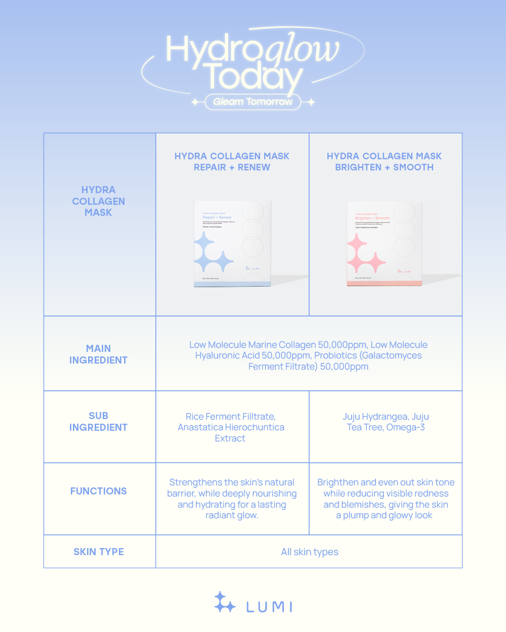 Your favourite Hydroglow Masks in a bundle? Say less! The Hydroglow Deep Gleam Bundle includes our Repair + Renew and Brighten + Smooth Hydra Collagen Masks — plus you’ll receive a COMPLIMENTARY box of Brighten + Smooth Hydra Collagen Mask. Ready for gleaming skin with zero effort?