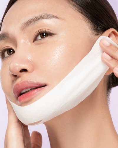 • Stretchy microcell fabric hugs the jawline to deliver a lifting effect, while dual-sourced collagen enhances elasticity.