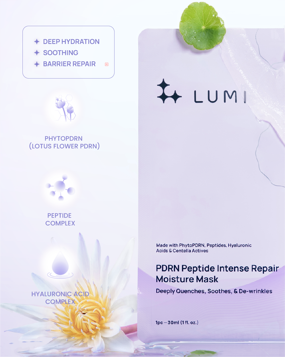 PDRN Peptide Intense Repair Moisture Mask: A thin, non-woven 1-piece mask infused with Lotus-Derived PDRN, Multi-Peptides, Hyaluronic Acid Complex, and Centella Actives. Best for deep hydration, soothing, and repairing the skin barrier.